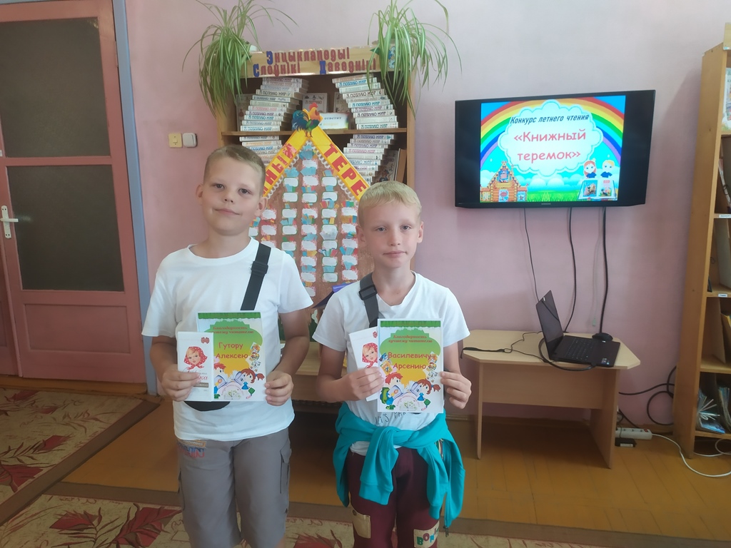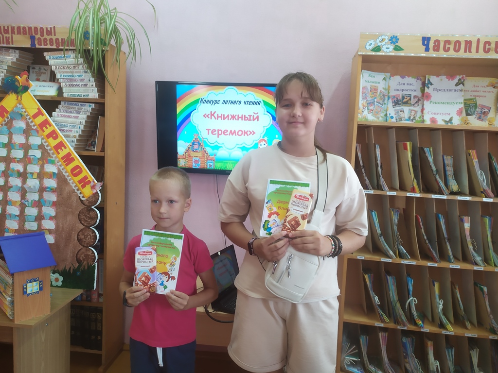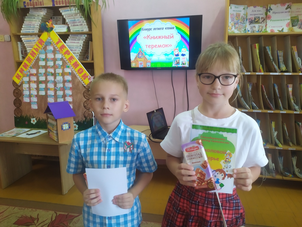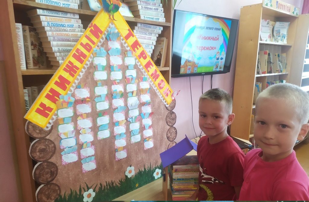 В рамках программы летнего чтения «Лето. Читатель. Книга» у нас проходил конкурс летнего чтения «Книжный теремок». По условиям конкурса за лето необходимо было прочесть не менее 20 книг, все прочитанные книги отражались на импровизированном экране.