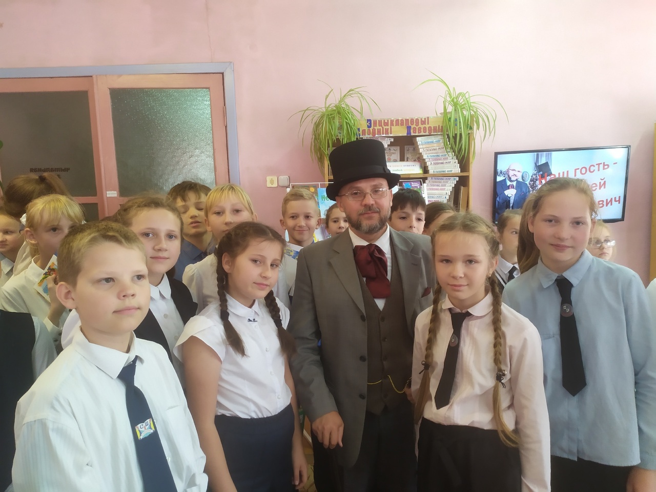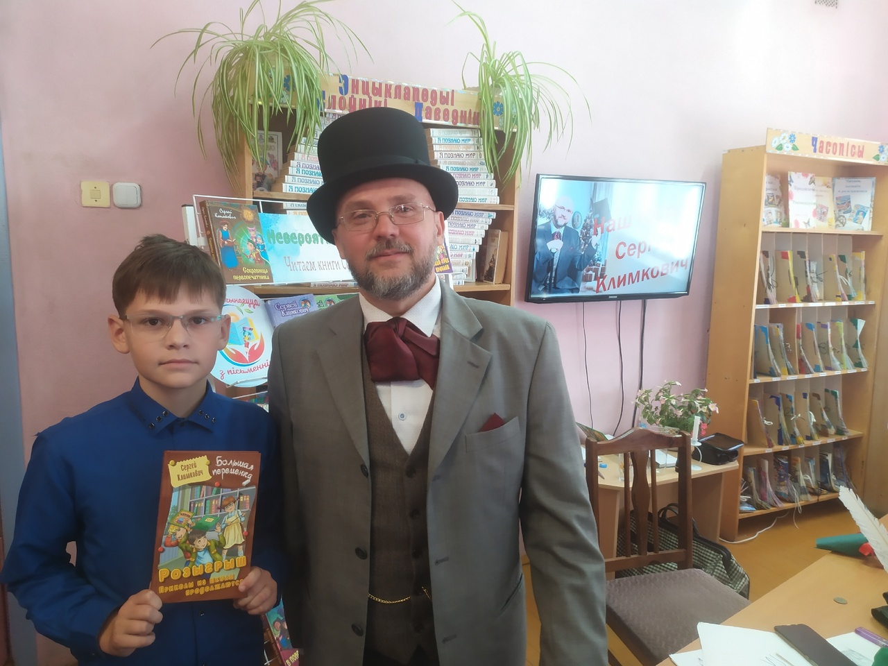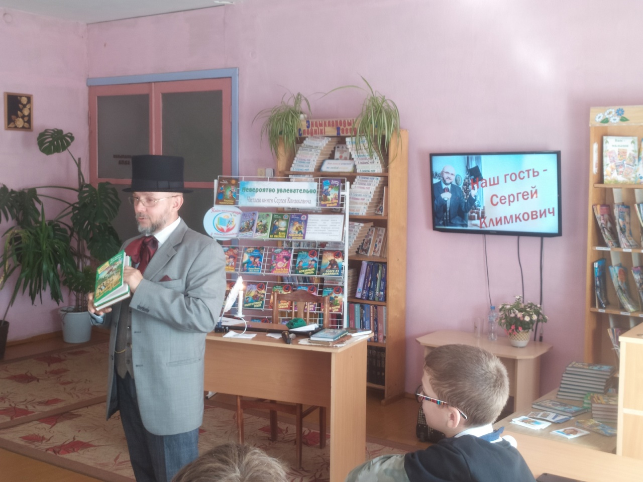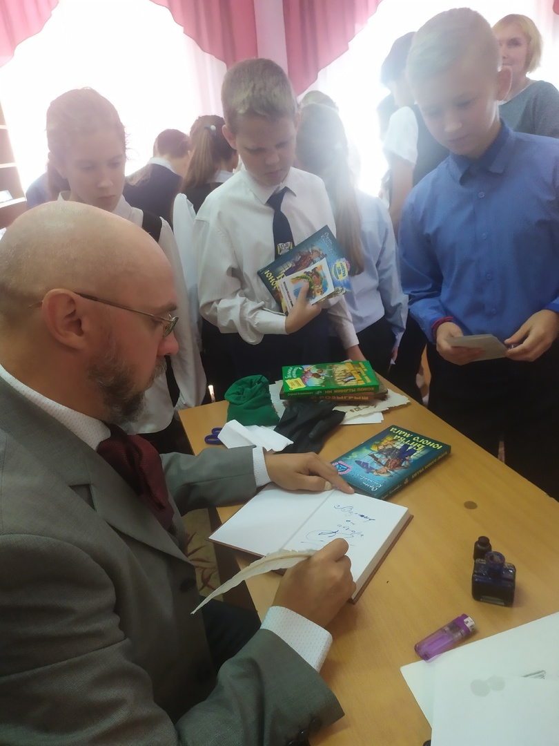 Писатель предстал в образе Сказочника в сюртуке волшебника, с цилиндром на голове, элегантной тростью и с первых минут заинтересовал ребят, виртуозно познакомив их со своими книгами. Ведь автор уверен, что современные дети хотят приключений, волшебства, удивительных открытий и путешествий в иные времена. Интересные факты биографии Сергея Владимировича помогла узнать игра «Правда или нет». Таким образом, наши читатели узнали, что первый рассказ писатель написал в третьем классе, что он мог сделать много ошибок в сочинении, а полюбил читать книги только в пятом классе. А еще ребята наперебой задавали вопросы именитому гостю. Их интересовало, сколько времени уходит на написание книги, как придумываются литературные персонажи, почему он решил стать писателем и многое другое.