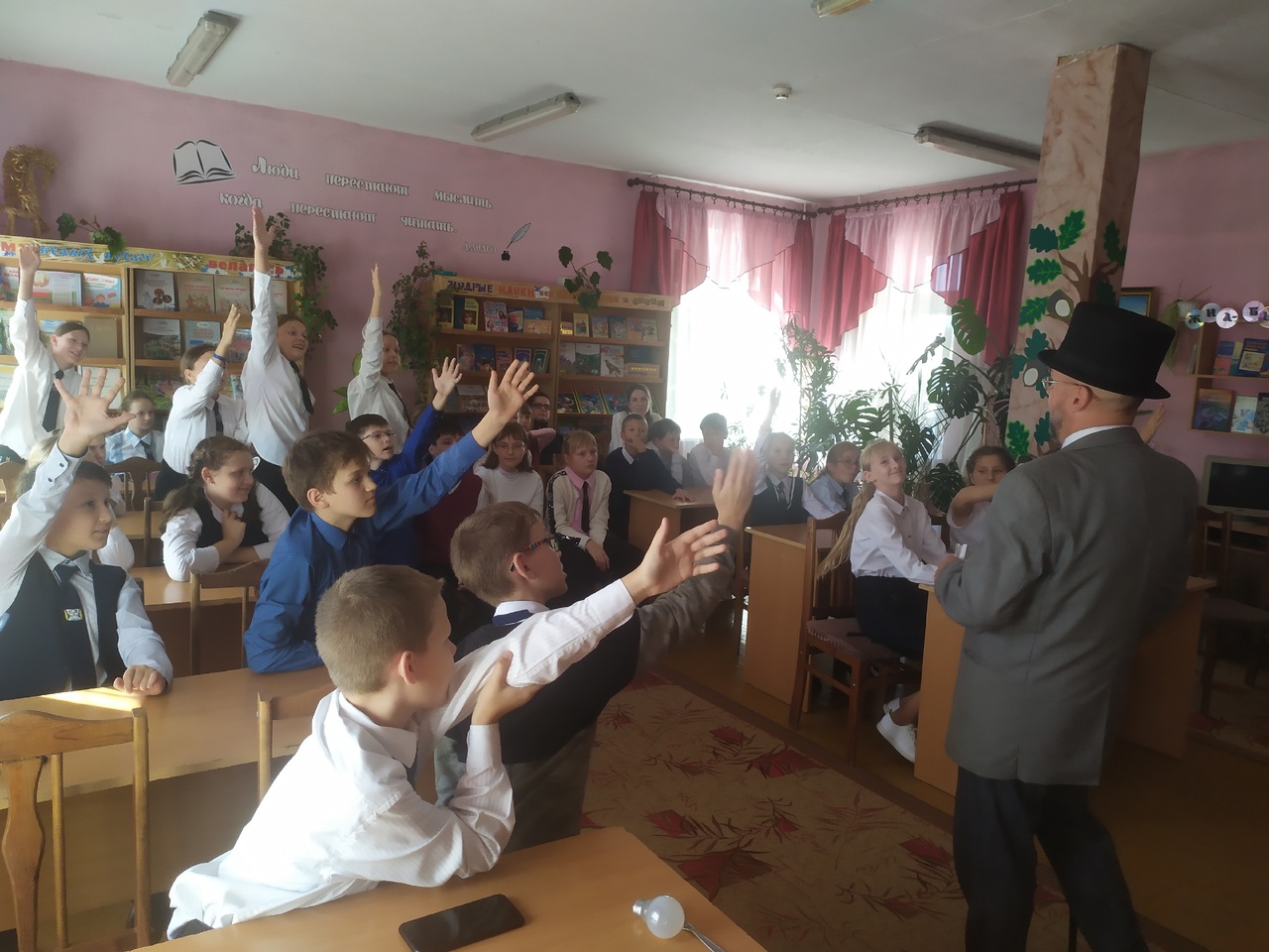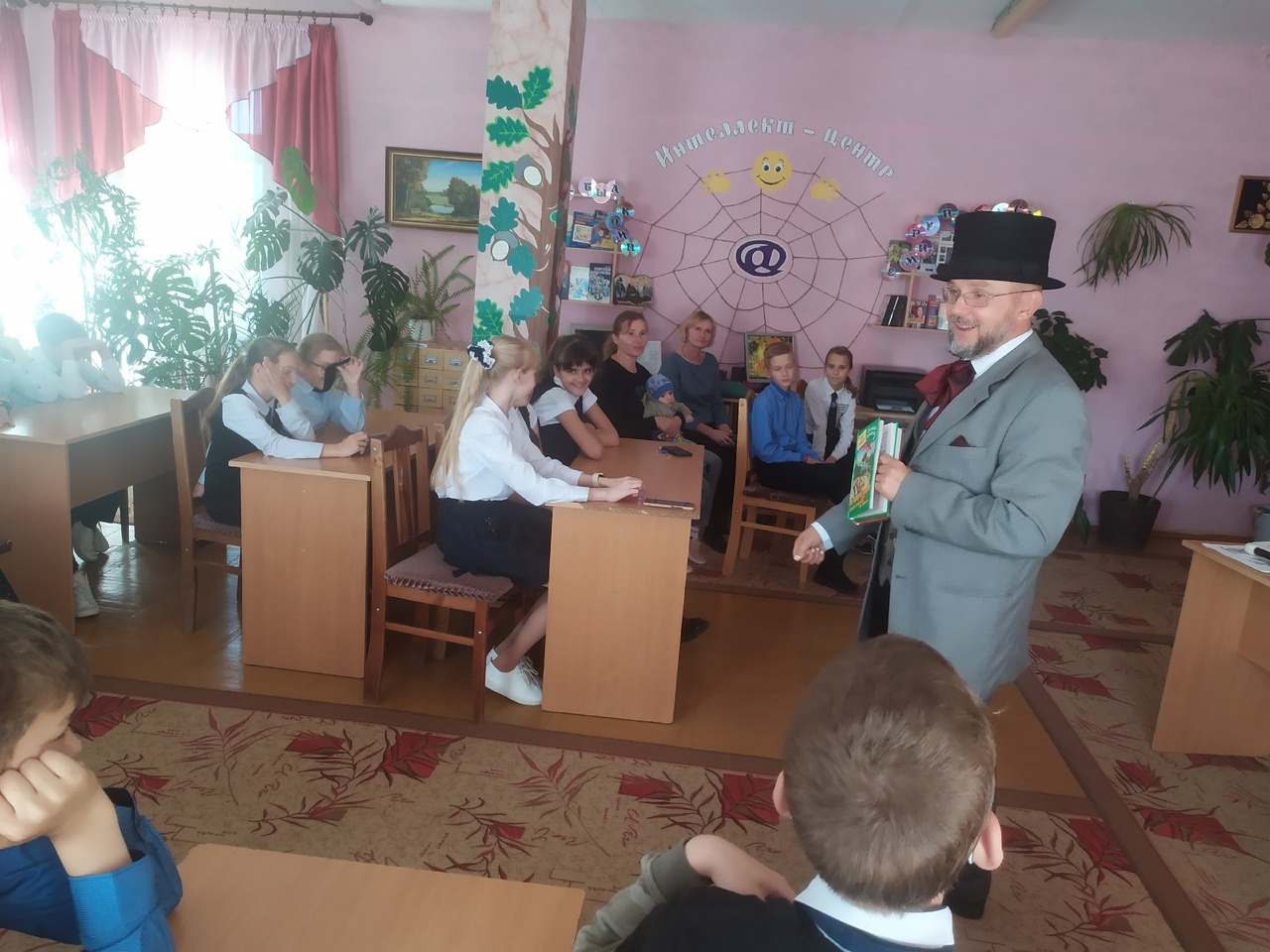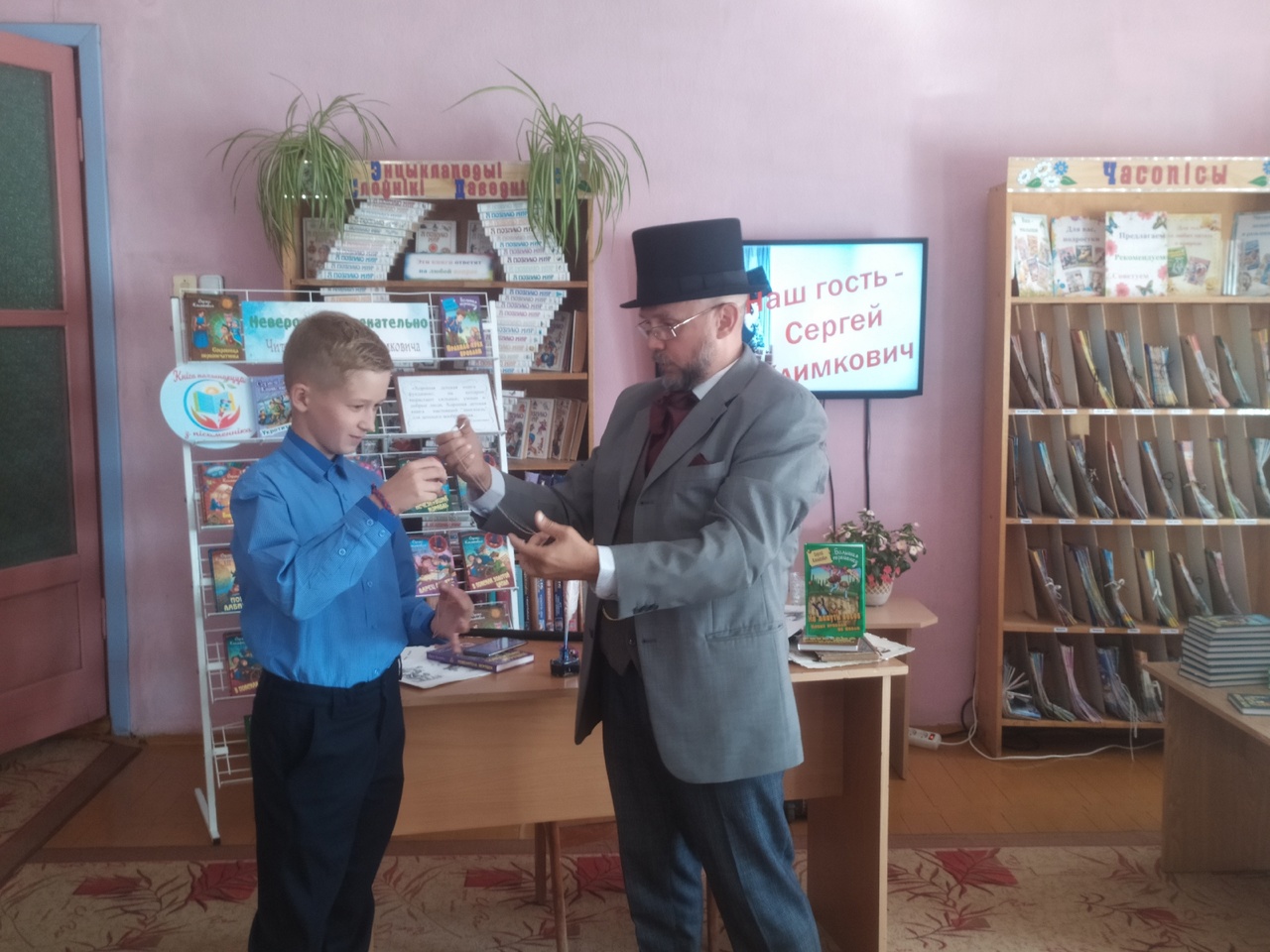 Писатель предстал в образе Сказочника в сюртуке волшебника, с цилиндром на голове, элегантной тростью и с первых минут заинтересовал ребят, виртуозно познакомив их со своими книгами. Ведь автор уверен, что современные дети хотят приключений, волшебства, удивительных открытий и путешествий в иные времена. Интересные факты биографии Сергея Владимировича помогла узнать игра «Правда или нет». Таким образом, наши читатели узнали, что первый рассказ писатель написал в третьем классе, что он мог сделать много ошибок в сочинении, а полюбил читать книги только в пятом классе. А еще ребята наперебой задавали вопросы именитому гостю. Их интересовало, сколько времени уходит на написание книги, как придумываются литературные персонажи, почему он решил стать писателем и многое другое.
