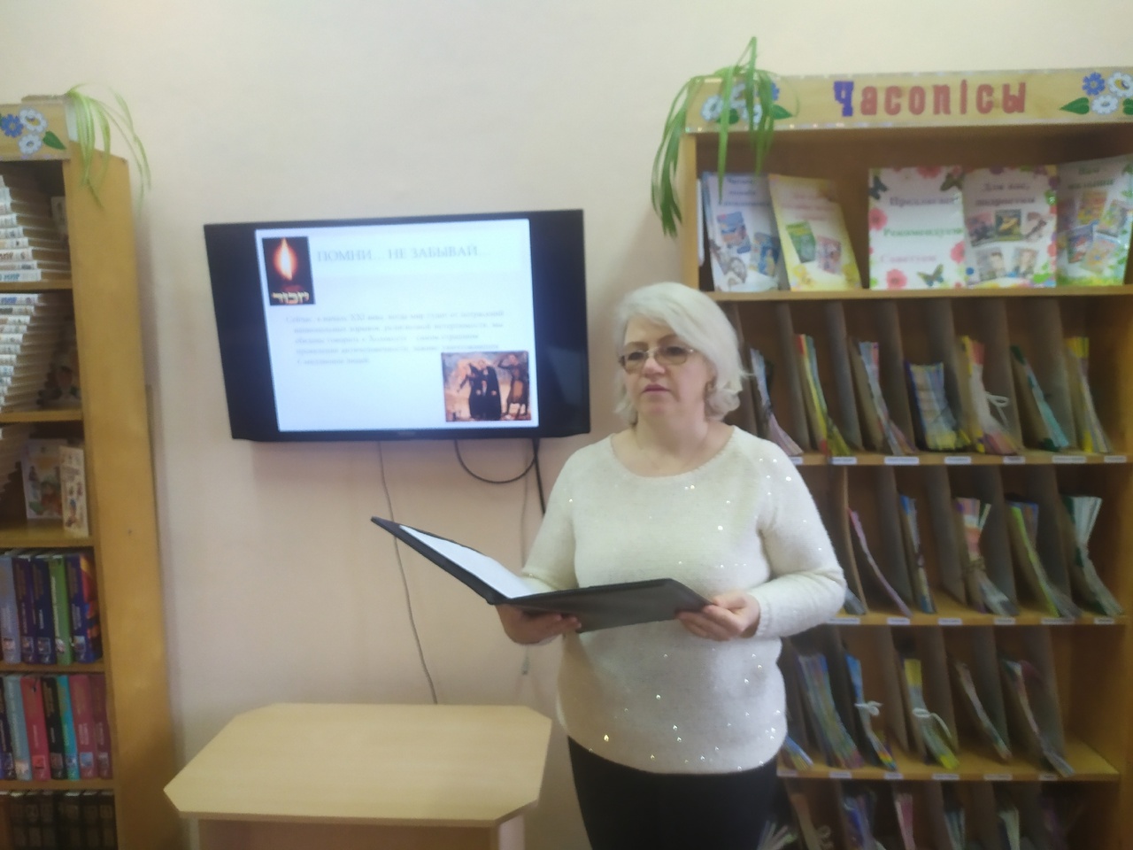 В ходе мероприятия библиотекарь объяснила значение слова «холокост», рассказала о том, что в сотнях малых и больших концентрационных лагерях были сожжены и замучены не только евреи, но и люди других национальностей. Ребята посмотрели мультимедийную презентацию по теме, узнали о «праведниках мира», которые, рискуя своей жизнью, спасали от нацистских палачей евреев и их детей.